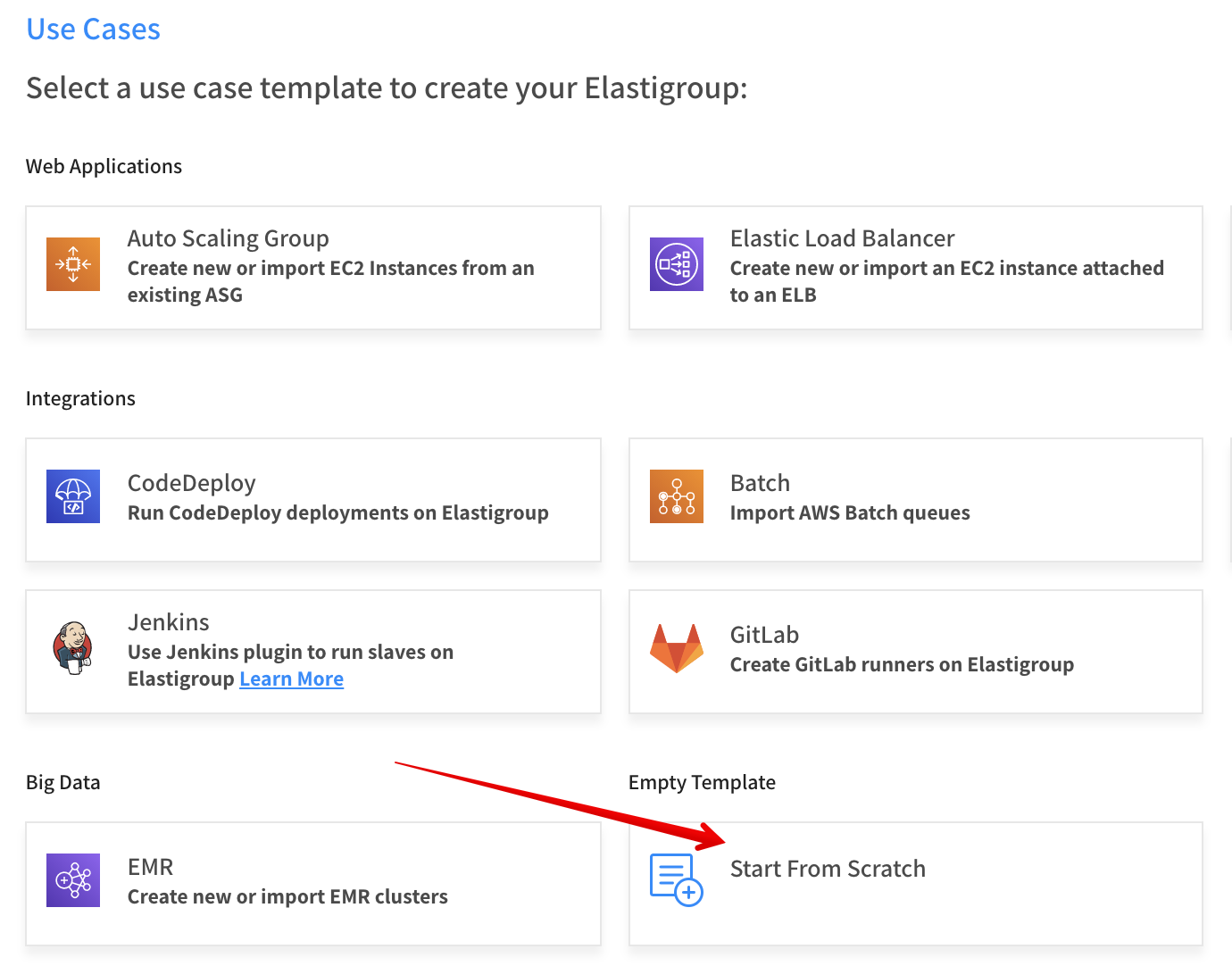 This procedure describes how to create an Elastigroup using an empty template. To create an Elastigroup based on an existing workload such as AWS Elastic Beanstalk or AutoScaling Groups, choose your workload type under Use Cases and import a copy of your workload configuration.