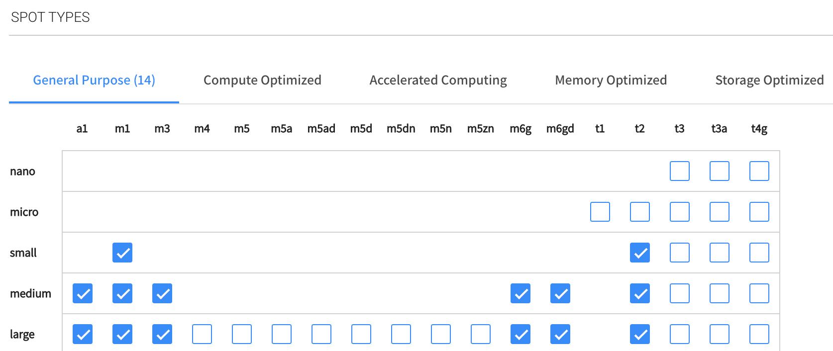 4. Spot Types: Choose the instance types Elastigroup should consider when launching your instances. We recommend selecting multiple instance types to provide Elastigroup with as many Spot instance market options as possible.